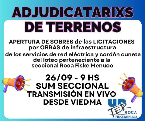 Se llevará a cabo este próximo viernes 26 de septiembre la apertura de sobres para obras de infraestructura en los lotes que la UnTER tiene y ya adjudicados en la Seccional Gral. Roca.