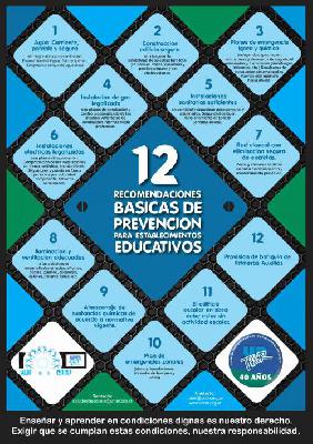 LAS 12 RECOMENDACIONES fueron enunciadas mediante NOTA N° 2604 del 23 de Febrero del año 2010 por parte del Ministerio de Trabajo y Seguridad Social de la Nación- Superintendencia de Riesgo de Trabajo, con el Objeto de disminuir los riesgos de infortunio que puedan ocurrir en los Establecimientos Educativos. Los 12 puntos básicos a tener en cuenta, fueron enunciados como