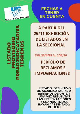 En función de la publicación realizada oportunamente sobre adjudicación de terrenos, se anuncia las fechas a tener en cuenta.